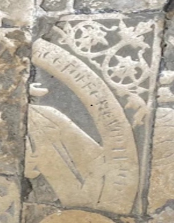 Actuellement à usage de linteau à l’angle oriental de la galerie intérieure du transept nord qui passe derrière l’horloge.