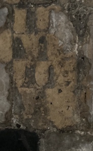 Actuellement à usage de linteau à l’angle oriental de la galerie intérieure du transept nord qui passe derrière l’horloge.