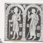 Autour de l’homme quatre chaussures. Une femme portant une palme et un fleuron.