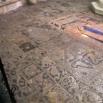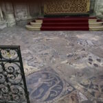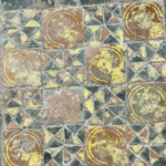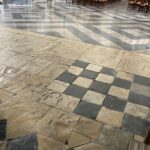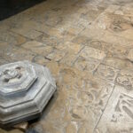 Cheminement complémentaire à la Galerie dans les dalles, fragments de dalle et pavés provenant de l’ancien dallage remplacé par le carrelage vernissé noir et blanc actuel.