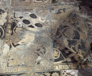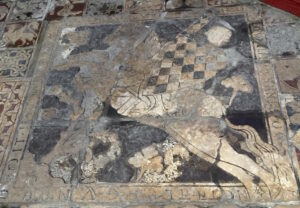 Cheminement complémentaire à la Galerie dans les dalles, fragments de dalle et pavés provenant de l’ancien dallage remplacé par le carrelage vernissé noir et blanc actuel.