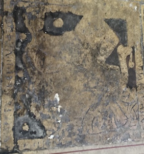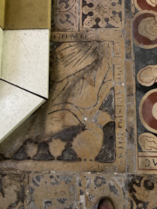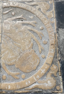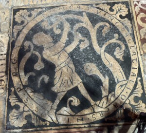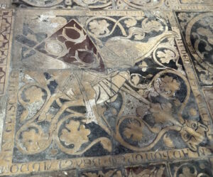 Au lieu d’un simple carreau de pavement, on s’est servi d’une dalle gravée du XIIIe siècle sciée.
